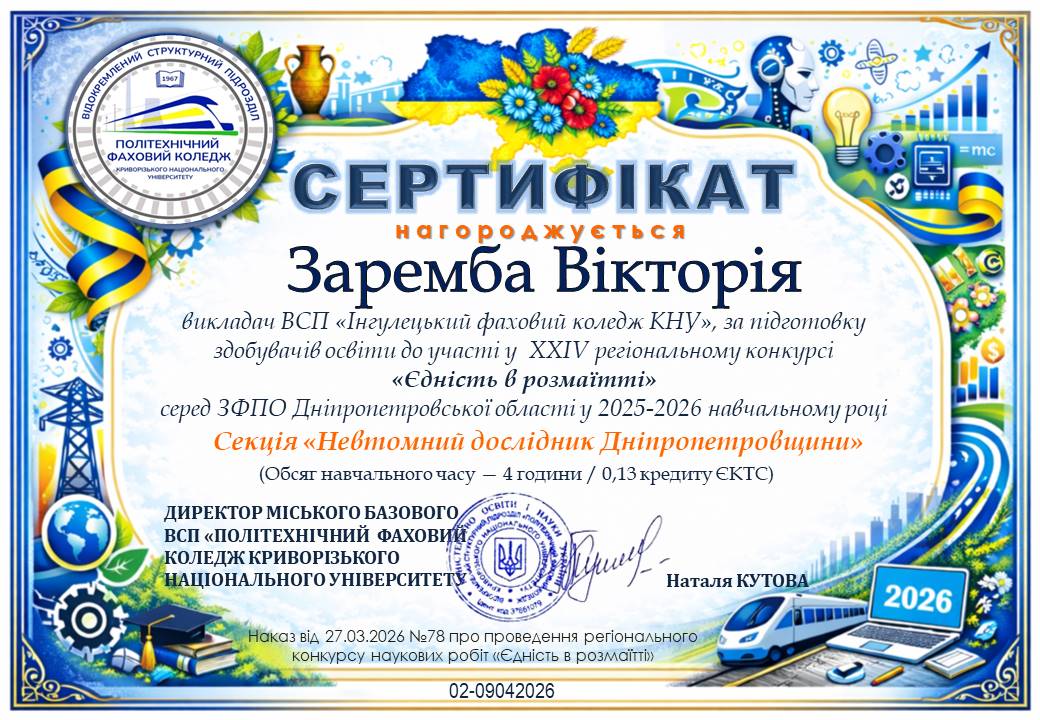Вітаємо з перемогою у регіональному конкурсі науково-дослідницьких робіт «Єдність у розмаїтті» студентів ІІ курсу групи ЕРГО 24 1/9 Тимура Золотаря та Іллю Никитюка!